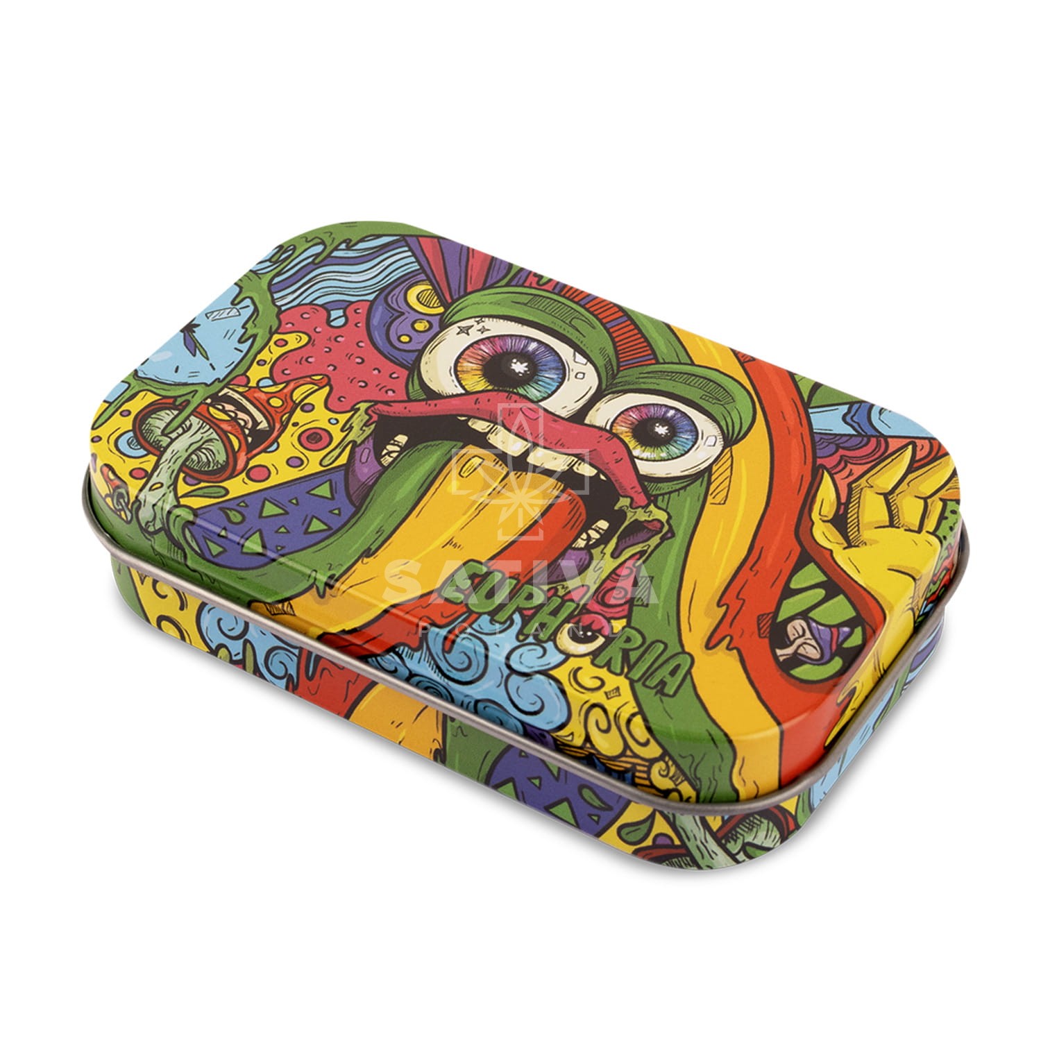 Kieszonkowe metalowe pudełko EUPHORIA to idealne rozwiązanie dla osób ceniących praktyczność i styl w codziennym przechowywaniu suszu, ziół czy drobnych akcesoriów. Metalowe pudełko wielokrotnego użytku o kompaktowym rozmiarze 95x60x21 mm łatwo zmieści się do kieszeni, torebki czy plecaka, umożliwiając bezpieczne przenoszenie suszu w każdych warunkach – czy to na spacerze, czy w podróży. Odważny design EUPHORIA z szaloną, charakterystyczną grafiką przyciąga wzrok i podkreśla Twój indywidualny styl, czyniąc to pudełko nie tylko praktycznym gadżetem, ale także stylowym elementem codzienności.