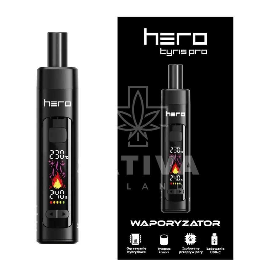 TYRIS PRO HERO to ulepszona wersja popularnego waporyzatora marki HERO z tytanową komorą grzewczą, hybrydowym systemem grzania(konwekcja + kondukcja) i technologią Smart Puff Identify. Nagrzewa się w 20 sekund, oferuje zakres temperatur 160–230°C z regulacją co 1°C i mieści się w kieszeni.