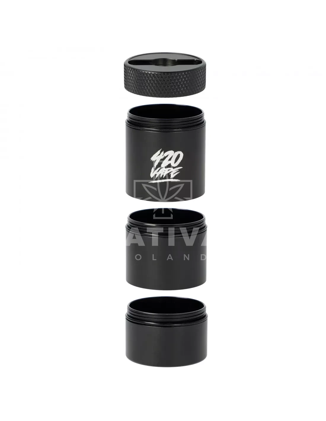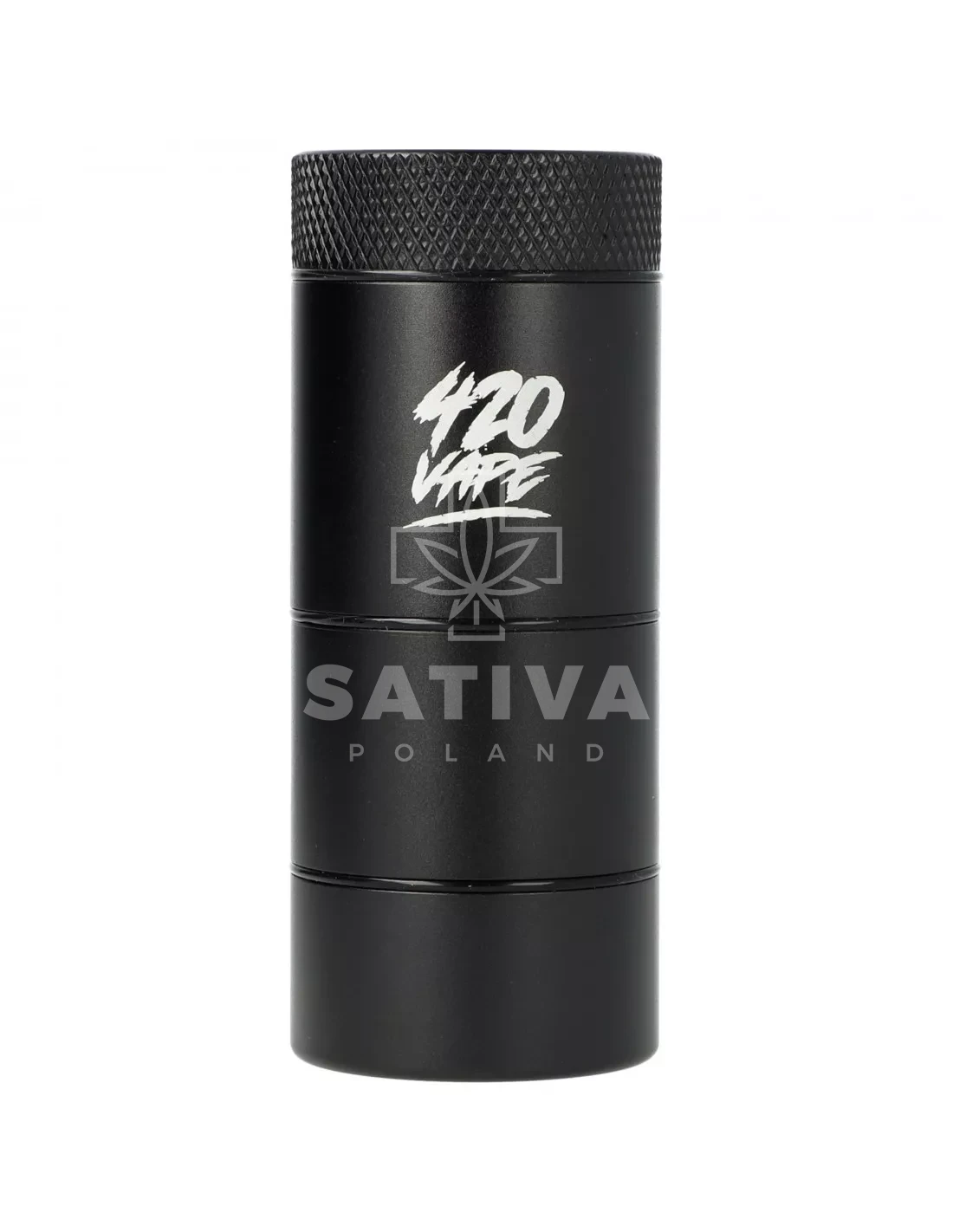 Całość wykonana jest z trwałego metalu w eleganckim, czarnym kolorze oraz sygnowana logiem 420VAPE. Pojemnik jest wodoszczelny i odporny na przenikanie zapachów, co gwarantuje pełną dyskrecję i bezpieczeństwo podczas transportu. To kompaktowy, a zarazem wielofunkcyjny gadżet, który doceni każdy miłośnik waporyzacji.